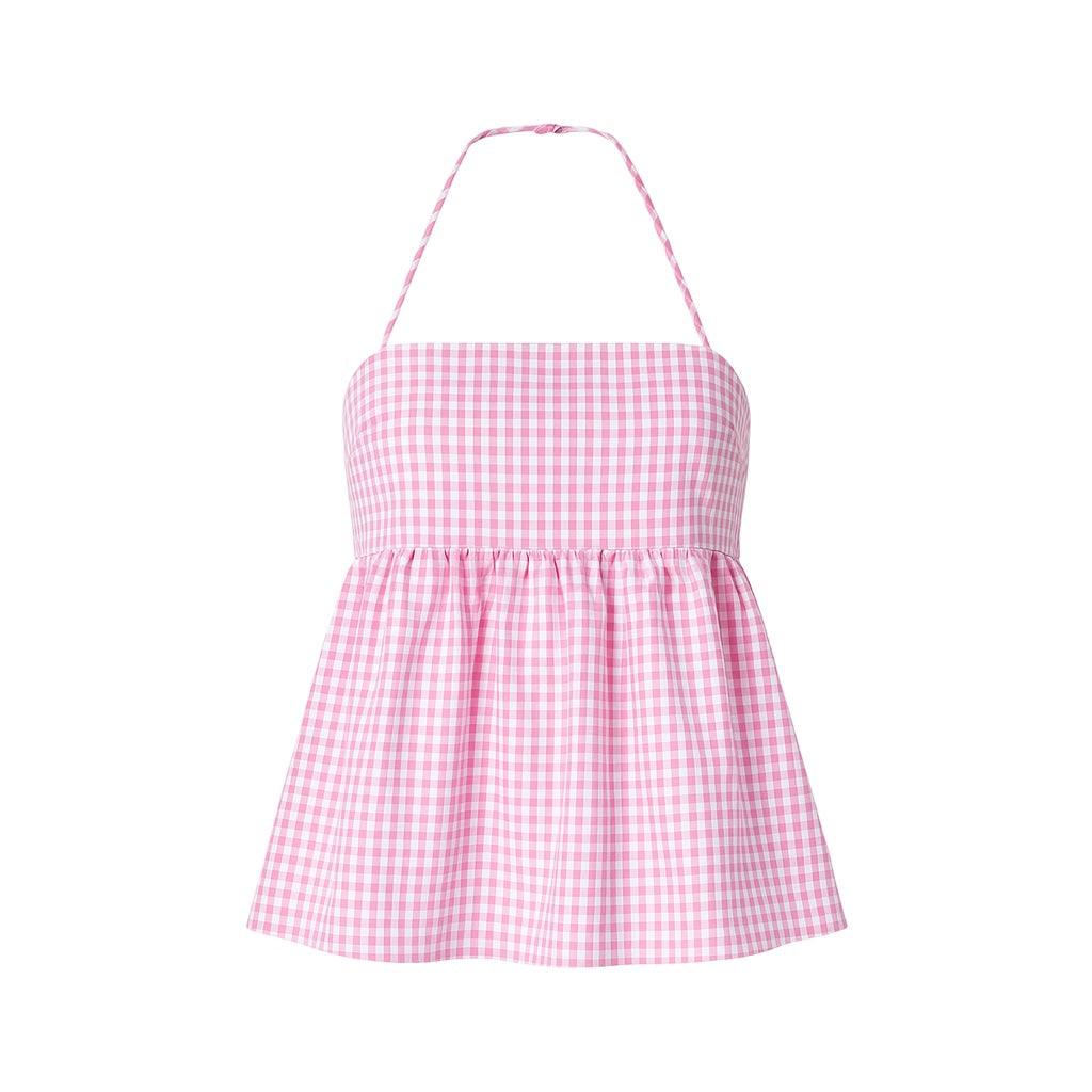 The Midsummer Top is crafted in a gentle pink gingham pattern with a flattering gathered waist and delicate tie straps. Perfect for warm days and slow mornings, this piece pairs beautifully with denim, linen, or your favourite relaxed layers.